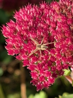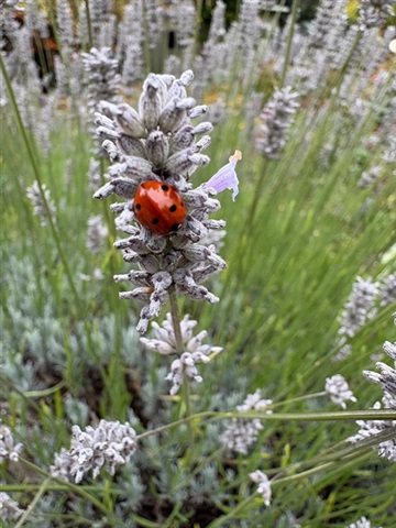 "Look closely (at my feet) and send us a photo" was something I was asked to do by my oncology helpline when I rang to discuss how sore my feet were getting. Very understanding support as always, but have you ever tried to photograph the underside of your feet, perhaps focussing in on a blister? Hilarious, sense of humour defnitiely required, glad no one was looking, as I contorted and wobbled, trying to keep a steady hand available to obtain the required images. Job done eventually, but this task was mirrored by some recent photos from the garden where I went out with one objective but ended up distracted and delighted by looking closely at what was in front of me, and nature just doing its thing. As I leant over a deep pink sedum plant, my eyes caught this little spider, hovering, and then darting off the flowerhead, quick as a flash. And then yesterday, as I tried to decide if it was time to prune the old lavender flowers, I "spotted" this little dainty ladybird, perhaps just resting and infusing the wonderful lavender scent. A moment to savour!