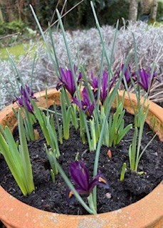 During autumn, I filled tubs with bulbs, like a squirrel preparing its winter stash. Now, if they haven't all become waterlogged, the shoots are appearing and first mini irises have emerged.