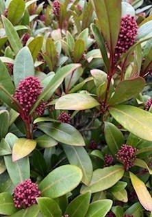 First it was the red berries of the skimmia bush beside the marvellous red branches of the dogwood.