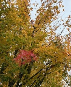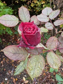The colour red: capecitabine had a sting in the tail for me this cycle; all had been reasonably OK until the last few days of the tablet fortnight. That nasty palmar-plantar side-effect seems to get me every time: sure enough, the colour red began to emerge on my feet with its accompanying soreness and peeling skin. My sympathies to any fellow palmar-plantar sufferers. I’ll spare the blog the foot photos, but instead, I turn to the garden where the colour red has shown itself, beautifully and often surprisingly. This time, a single red rose bathed in rain drops and a joyous patch of red amongst the golden acer leaves. Nature wins!