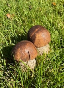 Following on from the delight of dahlias springing up from the flowerbed, my attention has turned since then to more autumnal developments and turning my gaze downward: a stormy weekend with winds bringing down the chestnuts and the "garden floor" (in other words, the soggy garden moss that I call a lawn) has produced its own unique world. Fungus! Chestnuts! Leaves! All heralding the change of season, and this in turn mirrors the progression of my chemo cycles which move slowly onwards, but somewhat stalled with an additional week off needed. On the theme of feeling alone, and a bit depressed by this delay, I was jolted into joy once again, by spotting these two little fungi friends - how sweet they seemed, popped up out of nowhere, enjoying the lush dampness of the mossy grass. The looked like two little "besties" sharing a secret!