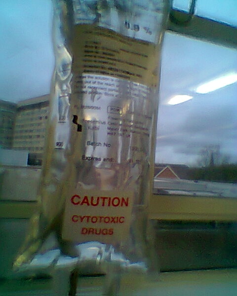 The Oxiliplatin Was infused over 2 hours without any of the side effects however during the flushing with saline my arm became very painful due to the fast rate of the flush. I could actually feel my veins in my arm pulsating with the rhythm of the pump. The next drug was 250 Mils of flourouracil which was pumped in at the same rate as the saline, followed by another flush. Now for the big boy. 1 litre of 5-Flourouracil over 23 hours plus the same again once that has finished. At this rate I will be in here until Monday. The canula is uncomfortable and I can see how veins get knackered from this type of treatment. I'm assured the the PICC (Peripherally Inserted Central Catheter) line will be much more comfortable with the drugs going direct into big vein leading to my heart. I Didn't sleep much last night so hopefully I will be tired enough to get some tonight. All this liquid is making me water the horse pretty often.