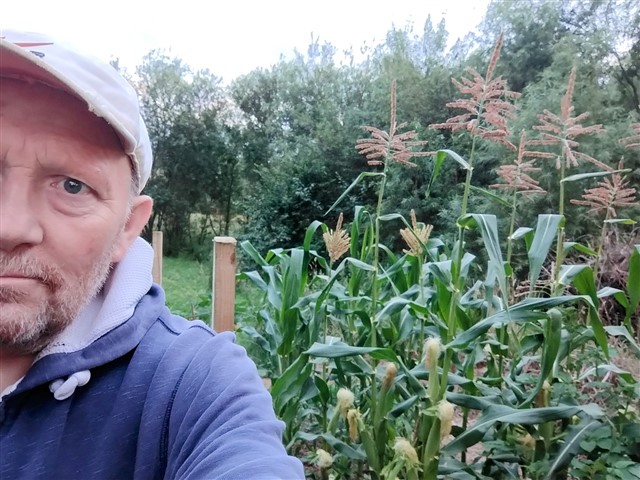 Sweetcorn plants below, they are planted in blocks of say, 3x3 or 4x4 etc because they are wind pollenated, the top darker "flowers" are the male flowers and the lighter flowers are the female flowers so theoretically whichever way the wind blows the female flowers get ripened. Another way to pollenate is to hold the top of the plant and shake it so the pollen falls to the lower, female flowers.