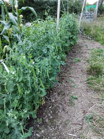 A drill of peas below, almost ready for pulling, can you see the pods?