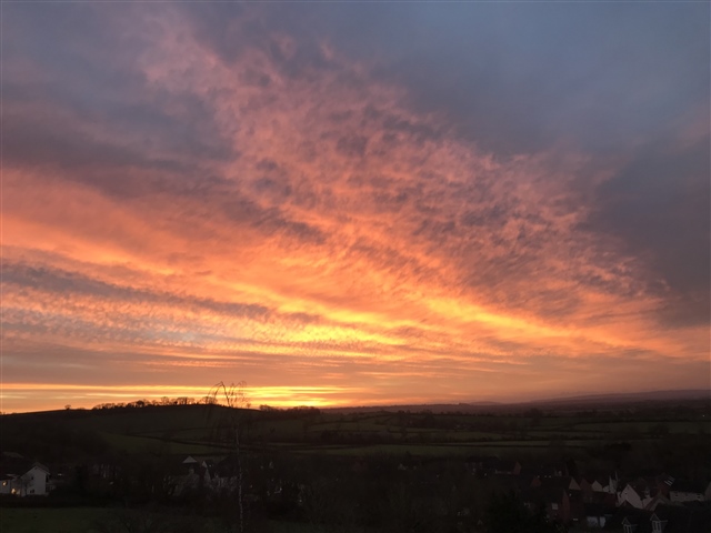 Hi,It’s grey and murky here in Somerset.I want to try and gather some leaves and apples as it’s slippery underfoot.I’ve got to book a Covid booster.My sister had hers on Weds eve and said she couldn’t function the following day.Photo is the sunset the other morning.Love to you all.Jane xx