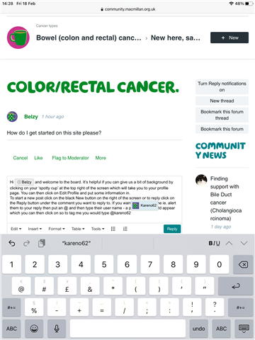 To start a new post click on the black New button on the right of the screen or to reply click on the Reply button under the comment you want to reply to. If you want to ‘tag’ someone ie. alert them to your reply then put an @ and then type their user name - a pop up box should appear like below which you can then click on so to tag me you would type @kareno62 then click on my name