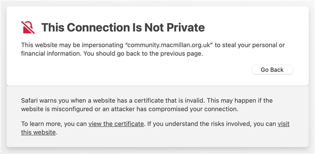 I've not been on so much as the webpage keeps showing that me warnings that the 'Connection is not private' that the website may be impersonating "community.macmillan.org.uk" to steal my personal information or financial information (I'll attach a screenshot) - so to be honest it worries me (especially as I don't understand most of this).