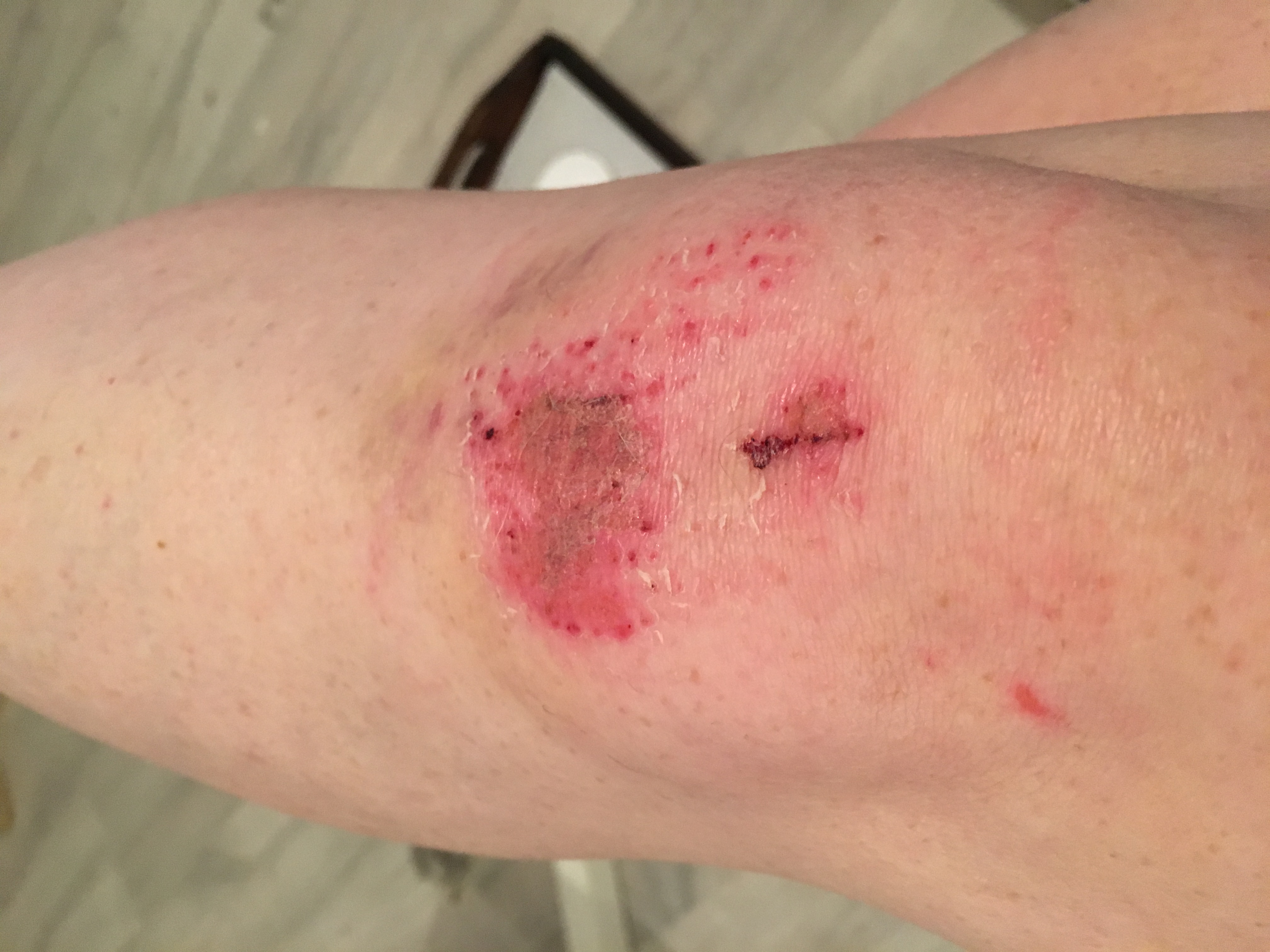 Then I went to the GP surgery, insisted I see someone to get it cleaned and dressed ( did not want the dreaded Cellulitis in leg!). I saw one of the practice nurses who poured a lot of saline solution on it ( painful) and then put a dressing and gave me a spare. I have not tripped and fallen for years. This is what it looked like, much better now. Saline solution really helped.