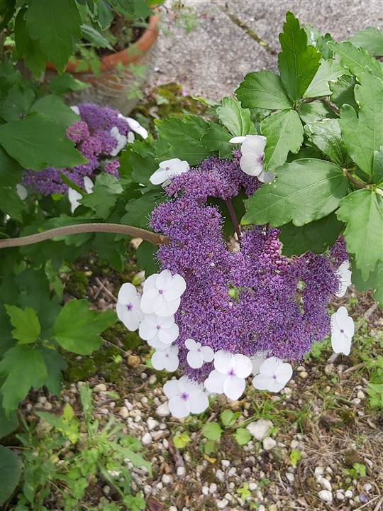 This is for you all....it's a Hortensia for those who like to know names but I call it my ' butterfly flower' because at a distance the little white flowers always look like butterflies surrounding a mauve flower!