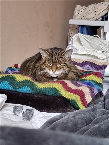 And I have a new mattress which is amazing. Can't feel the bed lever through it, can just feel lovely mattress, mmmmm.... And Tiki-toes has taken to it too! I put a cat bed at the foot of the bed where she sleeps in the daytime and she's curled up there now (Photo from this morning)