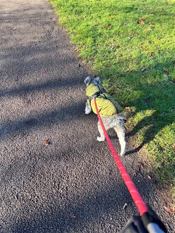 Morning walkies time (daughter is in London), Henry in his posh coat against the cold.