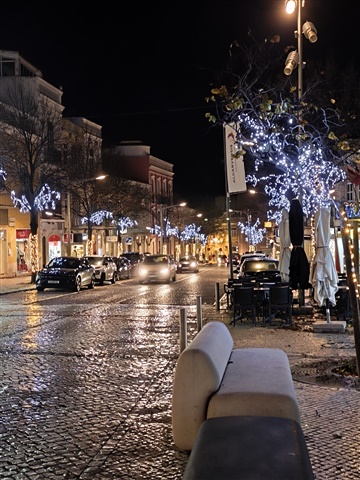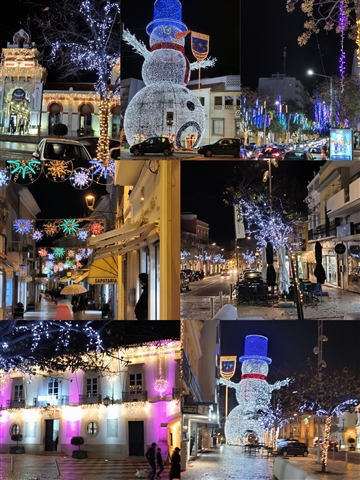 Later in the afternoon it was calmer and we needed to walk a bit so we went to a local hillside town. It had stopped raining but it does get dark early. Suddenly as walked along, we were thrown into a magical fairyland.....we knew there were some lights and we'd seen the the snowman carcass but we hadn't realised every tree was strung with tiny lights too.