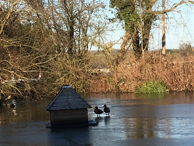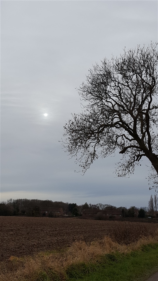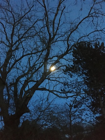 Today’s photos are ducks on frozen pond, snowy fields, shaggy sheep and the moon through branches. Was a lovely walk back over the heath, didn’t realise how dark it was until we got to the last little woods! Best walk of this year I think. Love to all, HFxx
