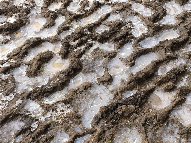 Interesting patterns in the icy mud,HappyFeet1,and that sign is so funny!!