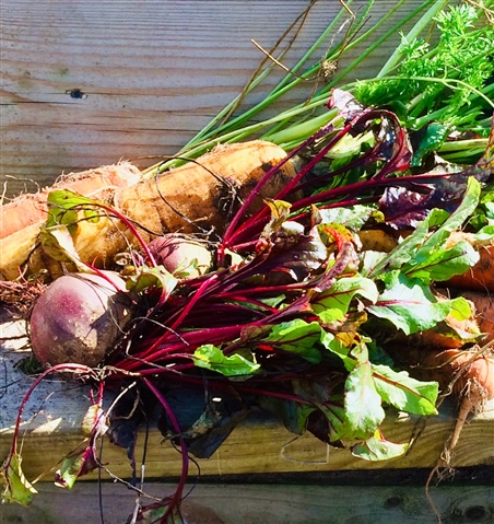 Might be orange and purple (?red). Anyway, my carrots and beetroot.