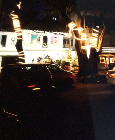 My walk last evening down busy streets ... pic not so good but it’s of decorated trees ... lights are wrapped around them..