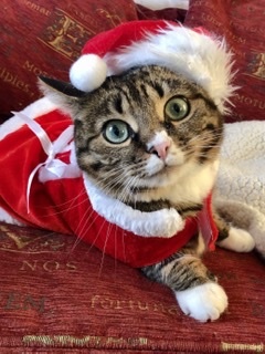 I arrived back home to find our munchkin cat, Piccolo in her Santa outfit! Lol