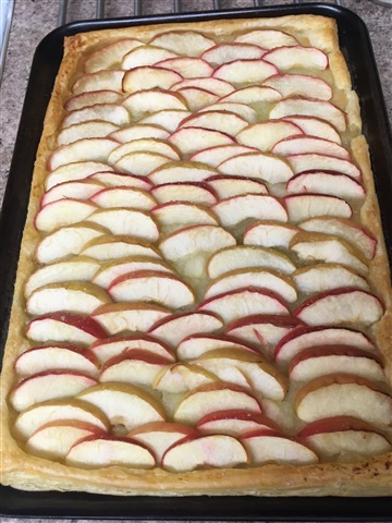 Good idea moomy cooking it on a rectangular tray. I usually use a flan dish......it's a Normandy Apple Tart if anyone needs to check a recipe....but it can get messy to dish up if the stewed apple is a bit loose. I would imagine you get better slices with that shape. How is the leg tonight?