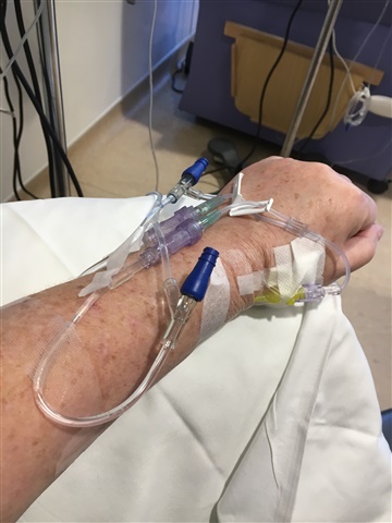 I had a jug of water, replenished frequently and had to record how much I’d drunk on a chart. The loos were close by, and I was there very often through the day! I had to unplug my IV from the mains and pull the stand and cables with me to the loo, and had to wee in a cardboard bowl so I could record my output.