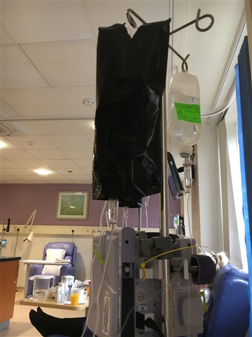 Once I was signed in, my drugs were brought up from the pharmacy. By 10am, one of the nurses would have put my cannula in and I was hooked up to my drip-bags of liquid on a movable drip stand. I didn’t feel anything having the infusion-the IV included anti sickness drugs, magnesium and saline and then eventually the bag of Cisplatin. The other things are to ensure your system is well flushed, as chemo can be hard on the kidneys. I had blood tests the day before each session to ensure chemo could go ahead.