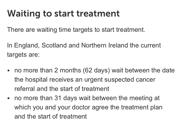 His initial referral was 2 years prior but never mentioned cancer until he had the endoscopy. It was confirmed end of March but eventually the MDT decided end of June what to do. Started chemo 2 weeks later. So they've got in under the 31 day target. But still a lot of wasted time when they knew he didn't want surgery because of a low % success for him