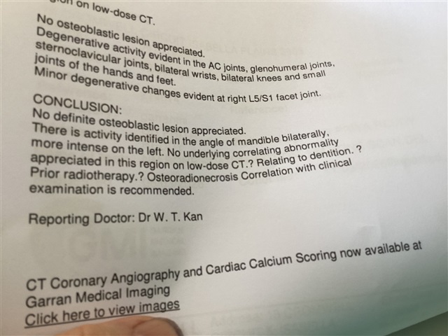 Hi all…Australian newbie not knowing if she is in the right place or not…I had a bone scan..scintiography? . The report say ? Osteoradionecrosis of the jaw..except I haven’t had any radiation to the neck or face. I have had radiation to the chest wall for breast cancer in 2019…. But I can’t find any information on this…