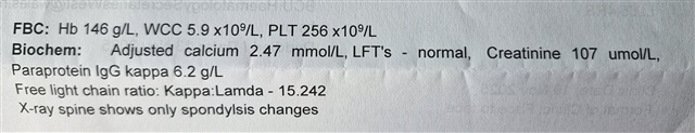 He had the appointment September this year, urine and blood tests. The consultant phoned him mid October to say he was referring him to haematology as he had protein that was coming from his bone marrow.