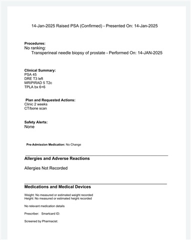 It's just the standard memo, hospital to GP. It's confirming his PSA. The DRE (digital rectal examination) felt there was cancer and the MRI returned a PI-RADS score of 5 (cancer highly likely Possibly T2c). He's had the bone scan so all you are waiting for is the biopsy results.
