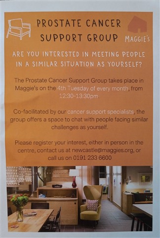 An advert here for anyone interested in joining the Prostate Cancer Support Group at Maggie's in Newcastle. We meet once a month (on the 3rd Tuesday of each month at 12:30pm).