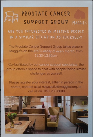 An advert here for anyone interested in joining the Prostate Cancer Support Group at Maggie's in Newcastle.  We meet once a month (on the 3rd Tuesday of each month at 12:30pm).